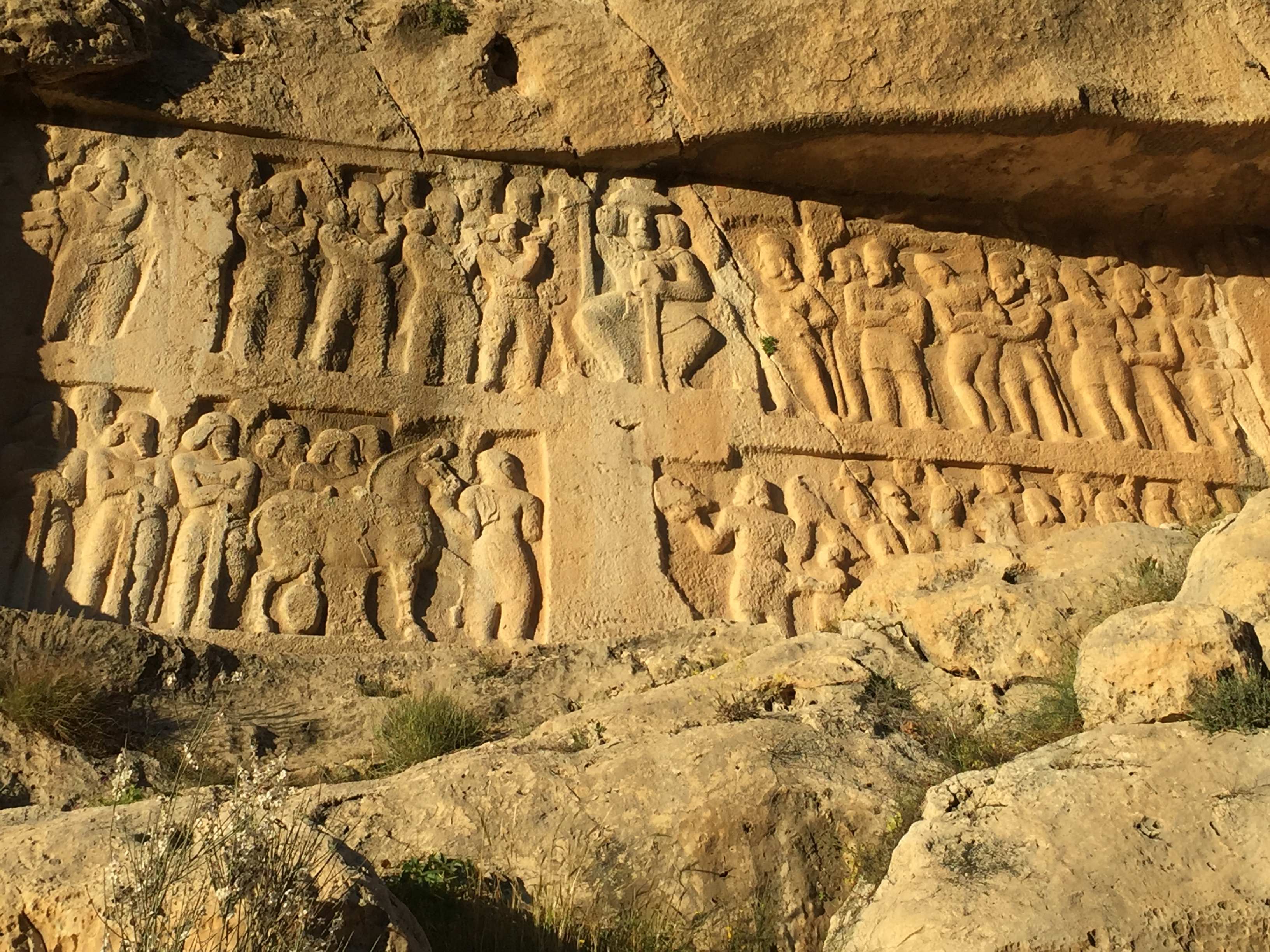 En route to Shiraz and Persepolis the following day we saw the spectacular bas-relief scuptures of Bishapur from the Sassanian era 224-632 CE which marked the defeat of the Roman Emperor, Valerian, by the Persians. These massive reliefs are carved into the limestone hills along the Chogan Gorge. Though damaged, they are fascinating early representations of the king and a warning to future invaders. They show details of costumes, the elaborate hairstyles of the early Persians, horses’ gear, amputated fingers, Roman clothing. It seems that even more spectacular carvings/ statues are found in the nearby mountains but as always in Iran there is so much more to see everywhere that we had to move on. Maybe some day…