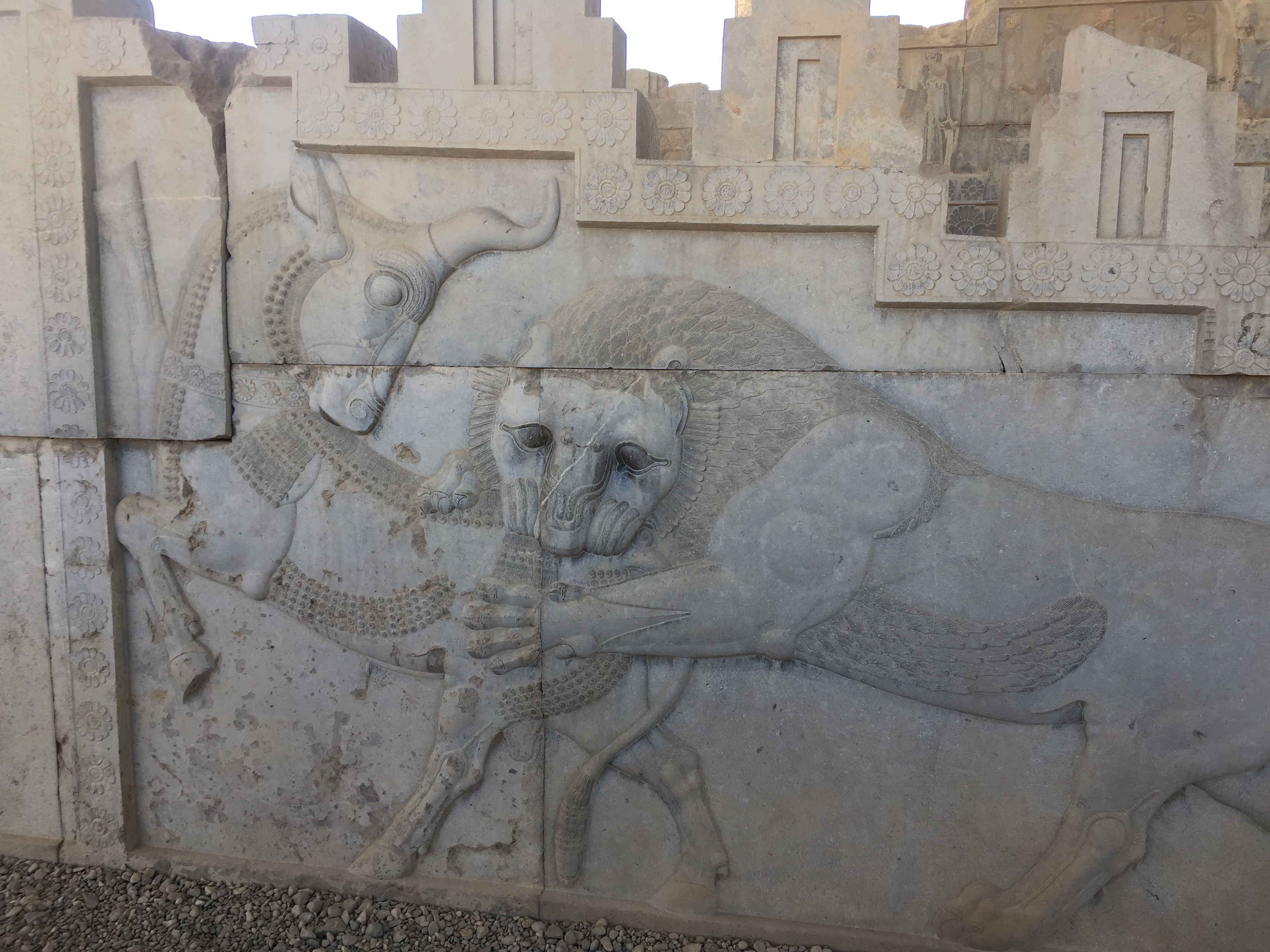 We wandered over the site and through the ruins of different palaces for some hours wondering at its scale and the beautiful monuments that survive. The dominant image of Persepolis is that of a lion attacking an ox. It appears over 30 times and is said to represent winter being overtaken by spring. Because of its gentleness, though depicting a (mortal) combat, the image has an ambiguity and an erotic charge that deepens the mystery of the site.